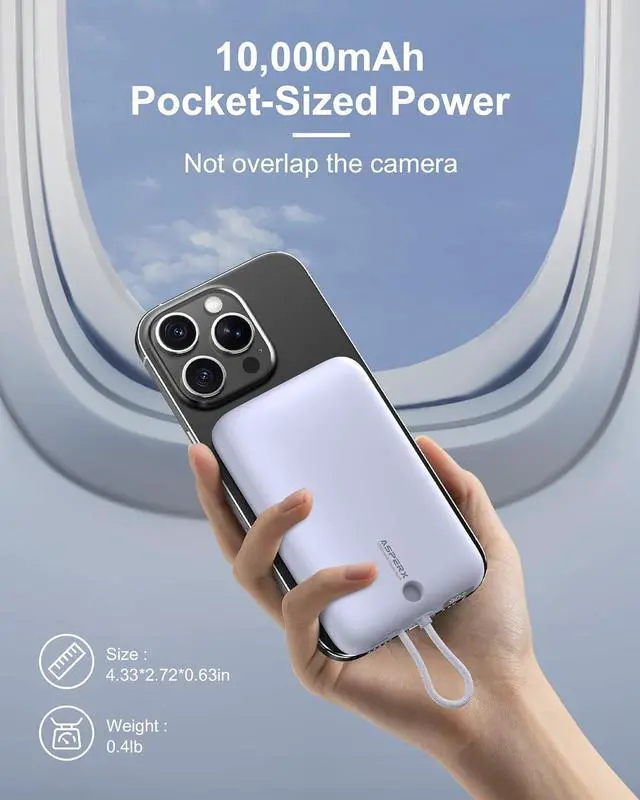 Pocket-Sized Power & Easy to carry: Compact design to snap to your phone and slip into your pack, purse, or pocket. The portable charger iphone weighing only 0.4 lb, its compact size of 4.33 * 2.72 * 0.63 inches, it will not block the camera. (Note: We recommend charging with MagSafe phone case or without cases to get enough suction for better grip)