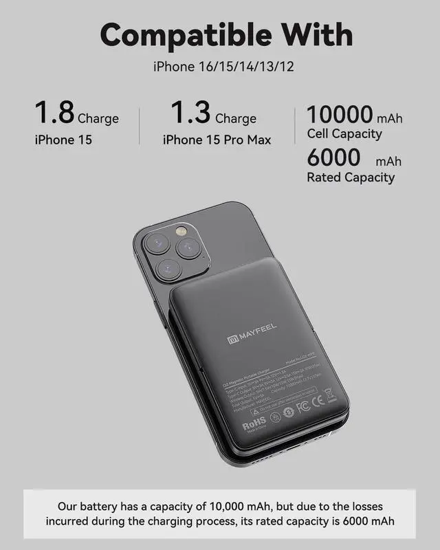 Universal Compatibility Compatible with iPhone 16/15/14/13/12 Series, the Mayfeel power bank ensures you stay charged wherever you are.