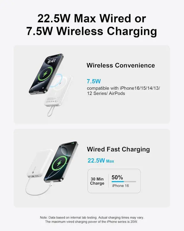 Snap: All-in-one portable phone charger combines wired and magnetic wireless charging features. For Magnetic power bank supports 5W, 7.5W and 15W wireless charging; USB-C ports support Power Delivery up to 22.5 W, allowing for fast charging of USB-C enabled devices, supporting Quick Charge 3.0 for rapid charging of legacy devices.