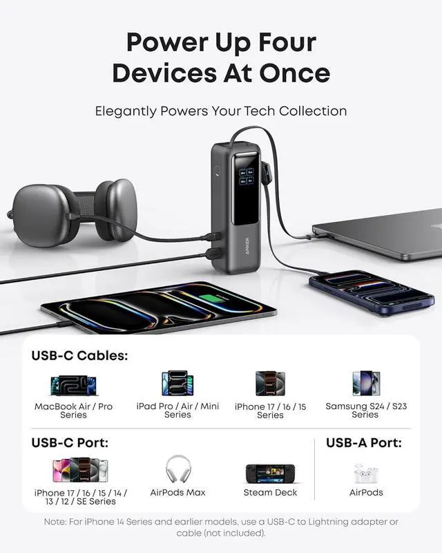 Travel: Features two USB-C cables one extendable up to 2.3 ft with 20 000 retractions and another at 0.98 ft cable that doubles as a durable carrying strap capable of enduring more than 20 000 bends. Built to handle family travel outdoor activities and emergency backup needs. Charge 4 Devices at