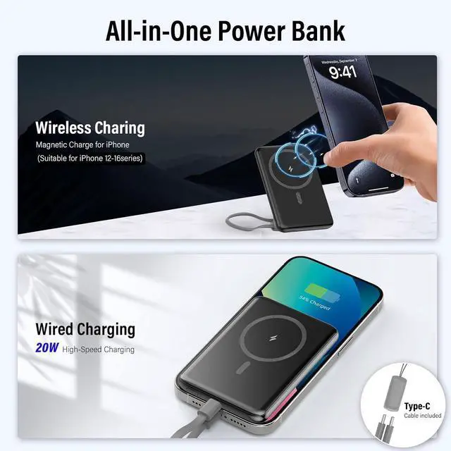 Magnetic wireless fast charging: Dbasne Magnetic Portable Charger1 second adsorption continuous connection upgraded 15W wireless fast charging (the industry average is only 7.5W ) for iPhone 15 Pro charging speed increased by 200%. Built-in 18 N52 magnetic cores + 1500g suction force running commuting and shaking will not fall off firmly attaches to your phone even during outdoor activities. No more dropping issues!. (Mobile phones that do not support Mag-Safe please wear a magnetic mobile phone case non-magnetic mobile phone cases are not compatible)20W PD fast charging + buckle lanyard two-in-one: Type-C port supports 20W wired fast charging charging for iPhone 15 to 70% in 30 minutes. Exclusive detachable buckle data cable charging mode 20W full speed direct connection portable mode instantly turns into a lanyard can be tied to wrist/backpack/keychain anti-lost and no need to bring wires. Ultra-Thin Design & Credit