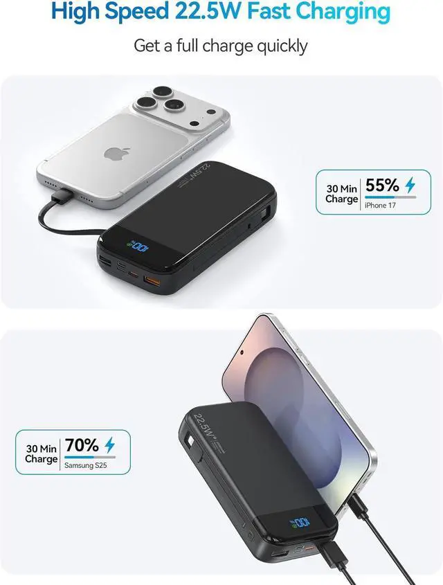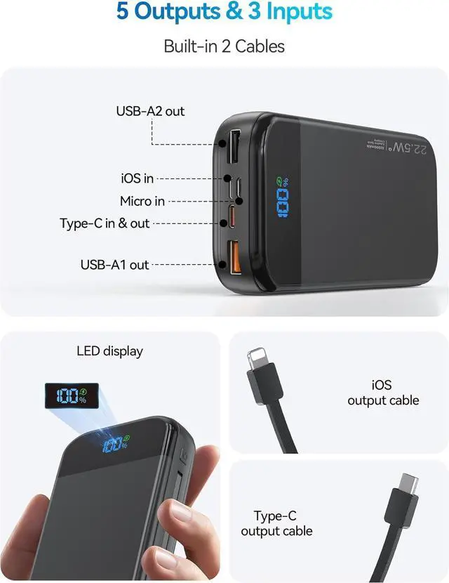 • Portable Charger Power Bank Built-in Cables 32000mAh 22.5W USB C Fast Charging 5 Outputs 3 Inputs Travel Essentials Battery Pack Compatible with iPhone iPad Google Pixel Black