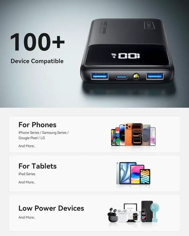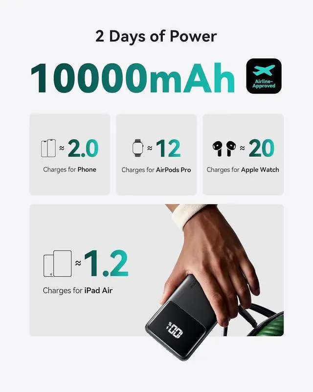 ? Ultra Portable DesignThe capacity of 10500mAh is stored in an incredibly compact body that is 36% thinner 15% smaller 28% lighter than its kinds. You can easily take it anywhere without feeling bulky and heavy.? Power for WeeksThe slim but powerful INIU 10500mAh portable charger can provide S10 with 2.3 charges iPhone 8 with 4.0 charges with 13.9 charges and iPad with 1.2 charges.? Vast CompatibilityINIU PD10500 fits every device from big as iPad and small as Airpods. Conveniently it can activate a special charge mode for your diverse devices.? What You GetINIU 10500mAh fast charge portable charger*1 USB C cable*1 travel pouch*1 user manual*1 INIU industry-leading 3 years INIU care and lifetime technical support