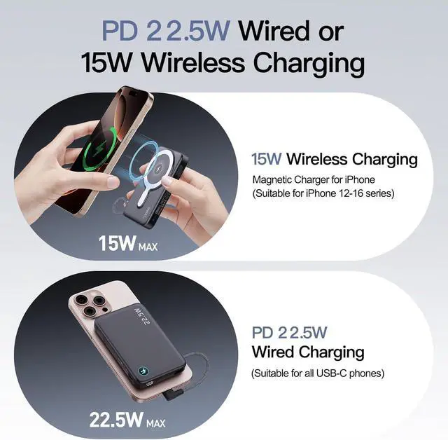 All Your Devices: Get back to full power in no time with 22.5W wired fast charging via the integrated USB-C cable and 15W wireless fast charging. Whether you're an iPhone user (MagSafe compatible for iPhone 15/14/13/12 series) or an Android user with a USB C device the M3 delivers rapid and efficient power. Its high-capacity 12800mAh Li-Polymer battery ensures multiple charges for your smartphones and other gadgets. Secure Magnetic Attachment & Broad Compatibility: Designed for seamless magnetic charging the charger offers strong stable attachment to your MagSafe-enabled iPhone ensuring your phone stays securely connected without fear of dropping. For other Qi-enabled phones (including Android devices) that do not natively support MagSafe you can still enjoy magnetic wireless charging by using a MagSafe-compatible phone case. Additionally the universal USB C port provides reliable wired charging for a wide range of devices making it a truly versatile power solution. Ultra-Slim Stylish