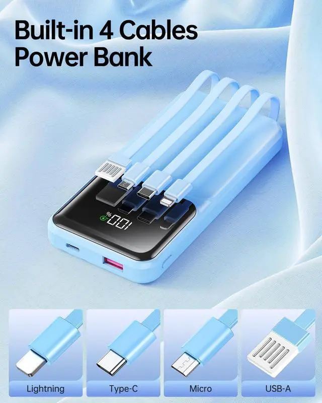 Digital Display Portable Charger: This cell phone battery pack with built in cables can protect your device from overcharge protection short-circuit protection take care of your electronic devices. LED digital large screen display the battery power even accurately to 1%