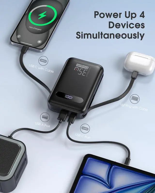 Charging: One Portable Charger for All Your Needs! Power up to 4 devices simultaneously! Features a built-in ultra-durable USB-C cable (input/output) and a Lightning cable plus an extra USB-C and USB-A port. Fully compatible with iPhone Galaxy iPad AirPods and more. No extra cables needed your ultimate power bank for an on-the-go lifestyle.
