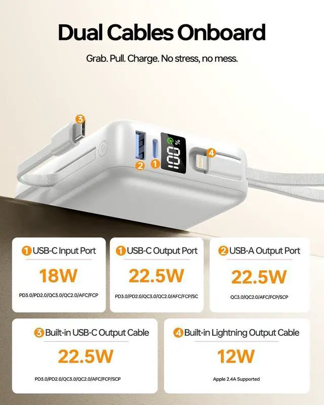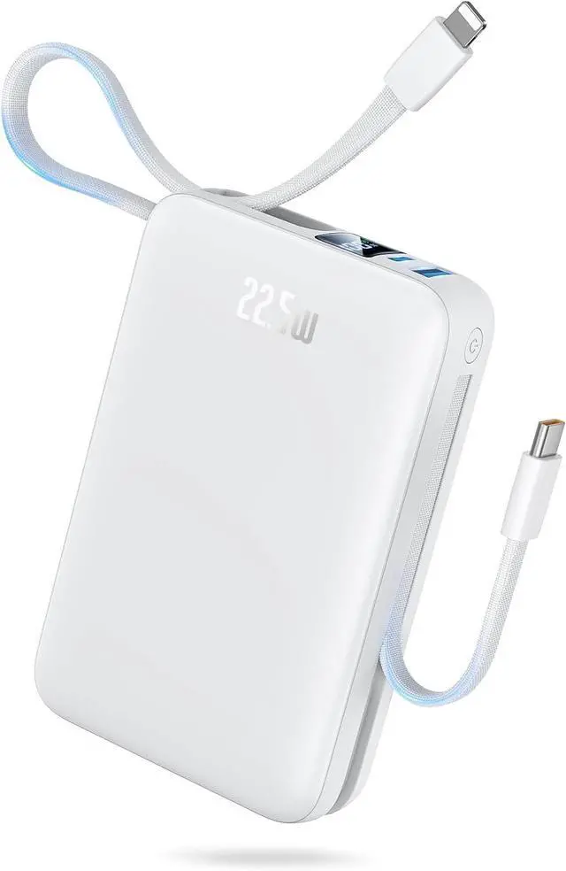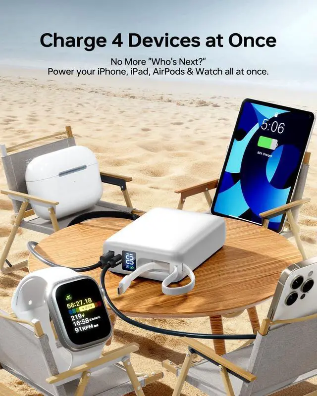 DEVICES SIMULTANEOUSLY: The power bank features 1 USB-C input/output port 1 built-in USB-C output cable 1 USB-A output port and a built-in Lightning output cable allowing you to charge up to 4 devices at the same time. The powerbank is suitable for most electronic devices such as mobile phones headphones tablets etc. making it easy for you to share with friends and family.