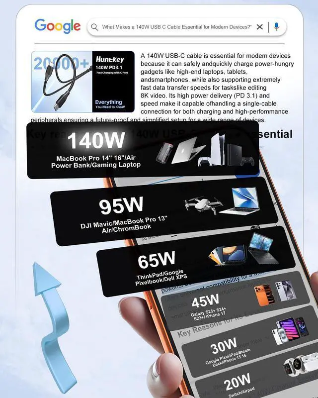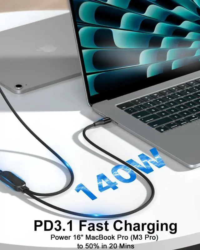 140w USB C to USB C Cable When supported by the device the maximum output power can reach 140w and it can charge a 16-inch MacBook Pro (M3 Pro) by 50% within 20 minutes making it more suitable for fast-charging devices.