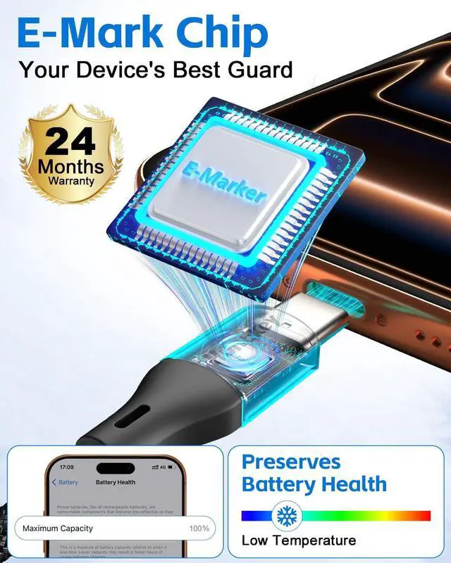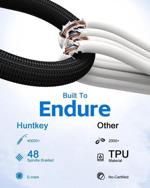 Note: matching a 140W Block for maximize efficiency. 2-in-1 Charger Cord Type C Dual port support PD 3.1 PD 3.0 PD 2.0 for fast charging. Intelligent power allocation dynamically adjusts charging power according to the devices connected optimized to ensure charging speed without overloading and achieved efficient and seamless power-on of the devices. Built to Last Charging cable adopts the E-Mark chip supporting PD 2.0 /PD 3.0 /PD 3.1 protocol output and intelligently adjusting the output power to protect the device battery. This macbook charging cable can maintain excellent performance even in harsh environments ranging from -104 to 248. Strong Durability material Made of high-quality nylon braided material and featuring a reinforced aluminum alloy connector design the ipad pro charging cord can withstand the strict requirements of daily use. Tested over 20 000 it features excellent durability and ensures a reliable connection every time. The including Velcro and removable snap make it more convenient to store and use. It is very suitable for business trips and office work. Brand Endorsement Founded in 1995 Huntkey specializes in innovative chargers and power outlets we provide global smart power solutions through cutting-edge tech. Our commitment to low carbon sustainability ensures fast safe charging with a 2-year warranty and 24/7 support trusted by millions of people worldwide.