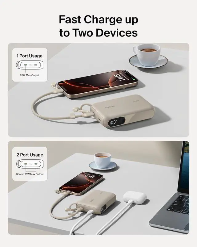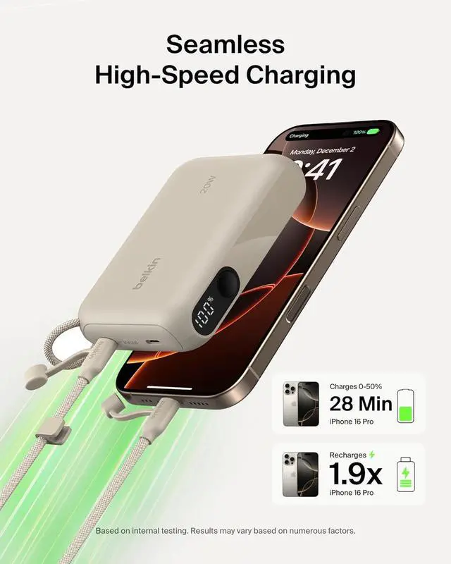 FAST CHARGING FOR YOUR SMARTPHONE OR TABLET ON THE GO: This versatile power bank provides a 20W max output to recharge your iPhone Galaxy iPad and more at home or on the go. Charge an iPhone 16 Pro from 0-50% in as little as 25 minutes.