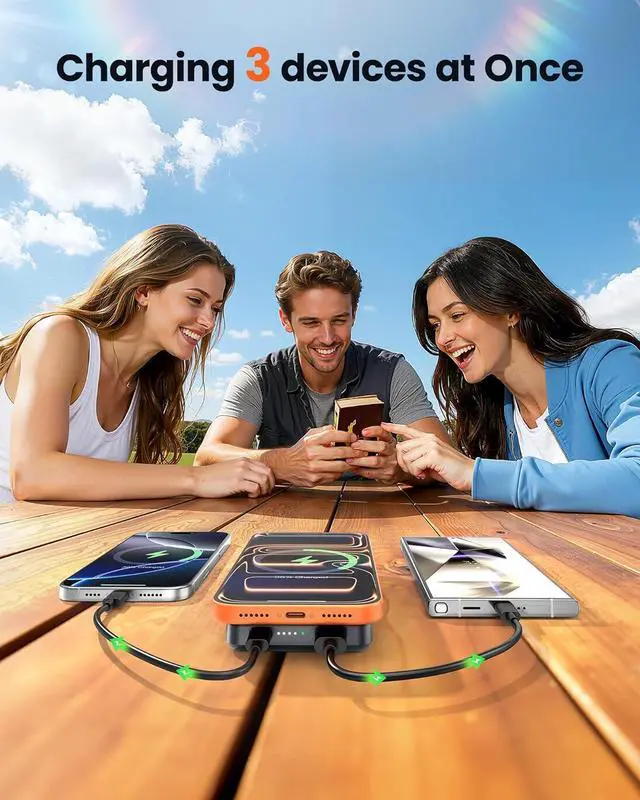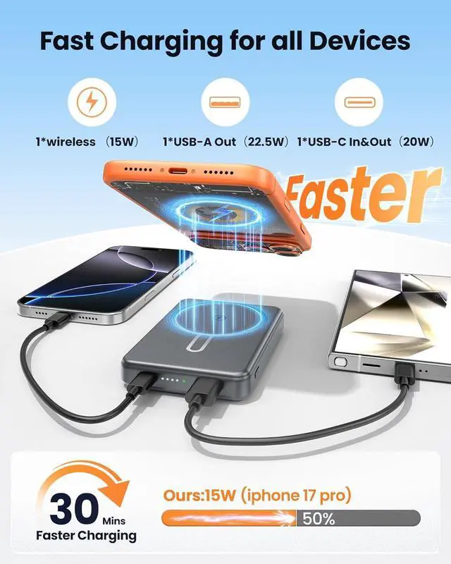 Magnetic Power Bank: This magnetic battery pack provides 3 charging ways supports up to 15W Max wireless charging PD 20W Max USB C output and PD 22.5W Max USB A output. This wireless charger can charge 3 Devices at the same timePocket Size Compact