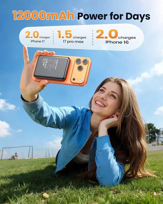 Capacity Power Bank: This 12000mAh magnetic power bank can provides about 2 charges for iphone 16 pro. Whether on a trip at work or engaged in outdoor activities the 12000 mAh capacity providing enough power for your devices without the constant worry of battery depletionFast Charging
