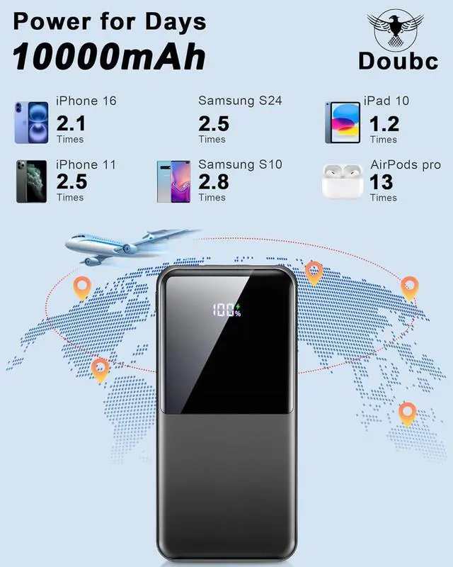 Power Bank & Universal compatible: 10000mAh Ultra-Large Cell Capacity phone power bank will keep your phone running all day. No more worrying about your phone running out of juice during outdoor activities like hiking. Compatible with most tech devices on the market full capacity support charge iPhone 8 3.8 times S23 1.8 times iPad mini1 1.6 times. Universal