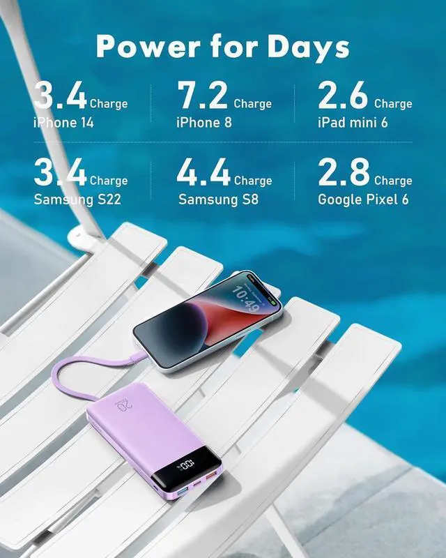 Virtually All Your Devices: Charge iPhones (all models) Galaxy/Pixel phones iPads AirPods Kindles and most tablets with this universal power bank. No more carrying multiple chargers - one solution powers your entire tech life. 22.5W PD Fast Charging - 50% in 30 Minutes!: Get a 50% charge faster than you can finish your coffee break. Perfect for emergency power before meetings or when rushing out the door. Exact Battery % -