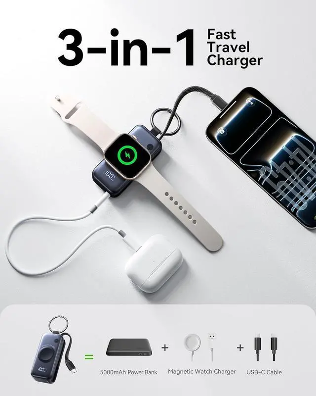 3-in-1 Clutter-Free Charging: Equipped with built-in USB-C cable and an additional USB-C port this 5000mAh portable charger with watch charger charges your iPhone Watch and AirPods all at onceeliminating the hassle of carrying multiple chargers. Market's Fastest