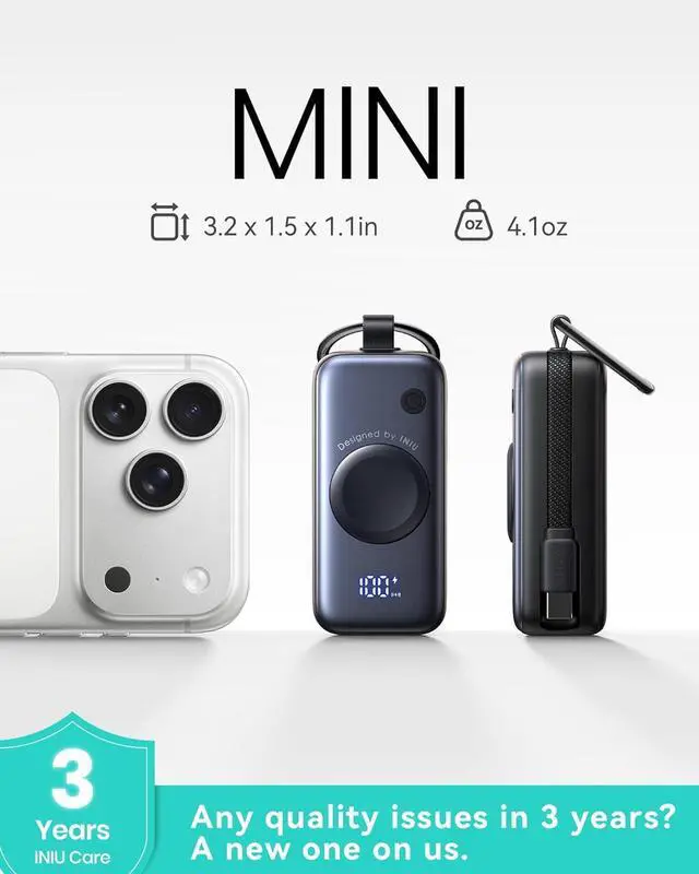 Mini & Portable: Compact enough to fit in your palm ( 3.2 x 1.5 x 1.1 inches) and weighing just 4.1 ounces the INIU 5000mAh power bank easily clips to your bag or backpack for instant access. Ideal for seamless charging during commutes or trips.