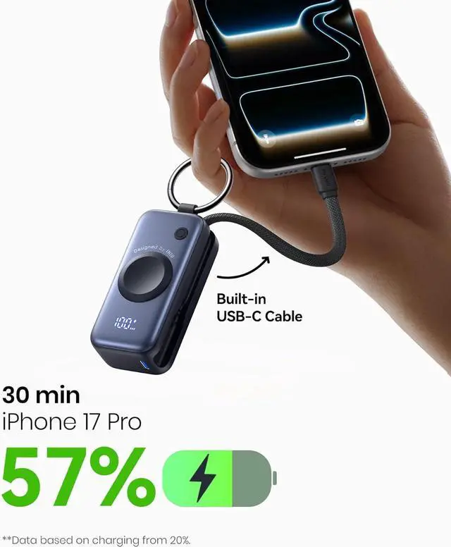 Instant Power Boost for iPhone: No more hunting for cables. INIU travel battery pack with integrated USB-C cable delivers PD 20W fast charging powering your iPhone 17 Pro from 20% to 57% in just 30 minutes. Plug in power up and get back to what matters.
