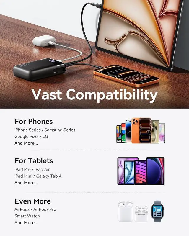 New-Gen Ultra-Compact 20 000mAh: Powered by the industry-first high-density TinyCell battery this compact power bank defies size limits. Enjoy high capacity without the bulk perfect for on-the-go convenience. Built-In USB-C Cable Grab & Go: Never forget your cable again with the built-in USB-C cablecharge with ultimate convenience. Recharge Once Power for a