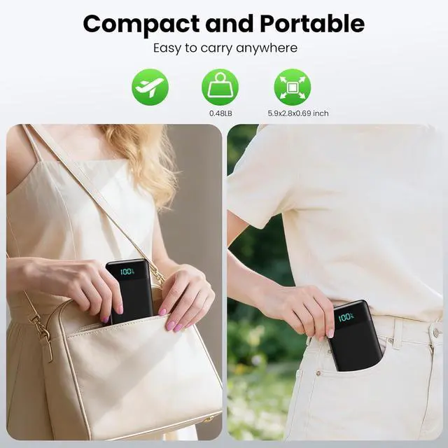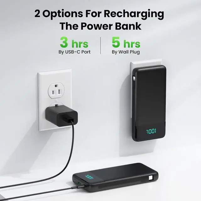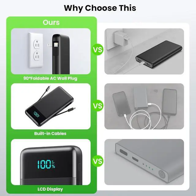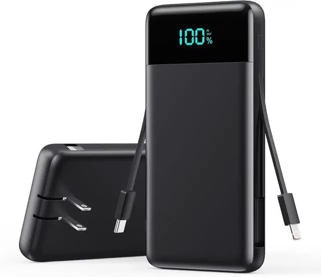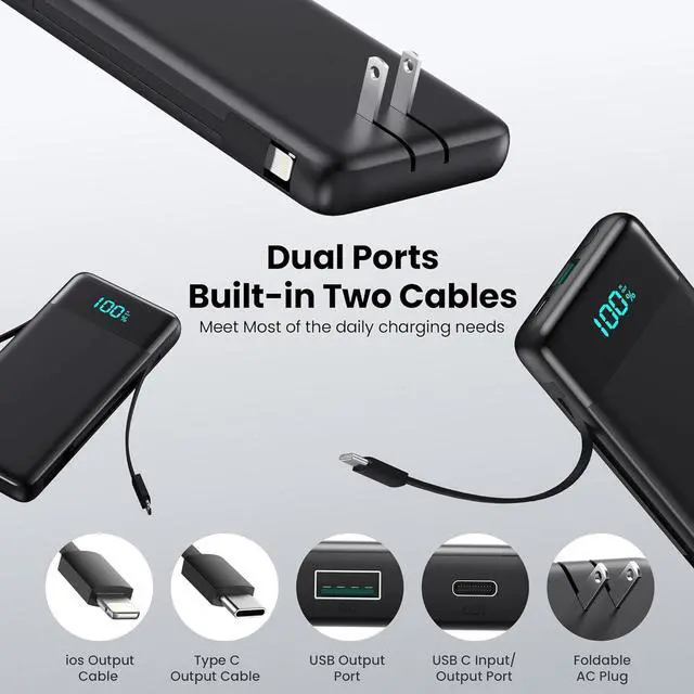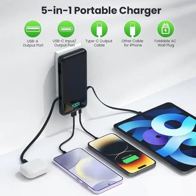 All-In-One Portable Charger No Extra Cables or Adapters Needed! Tired of carrying a tangle of separate chargers and cables? This power bank solves everything. Its integrated AC wall plug charges the bank itself directly from any outlet while the two built-in cables iOS USB-C ) + 2 ports ( USB-A USB-C port) mean you can power up virtually any device. Leave the clutter behind and experience true freedom on the go. Universal Compatibility Works seamlessly with almost everything you own. The portable battery charger compatible with iPhone 17/16/15/14/13/12/11/X series Galaxy Android devices and USB-C most mobile phones and smart devices etc.