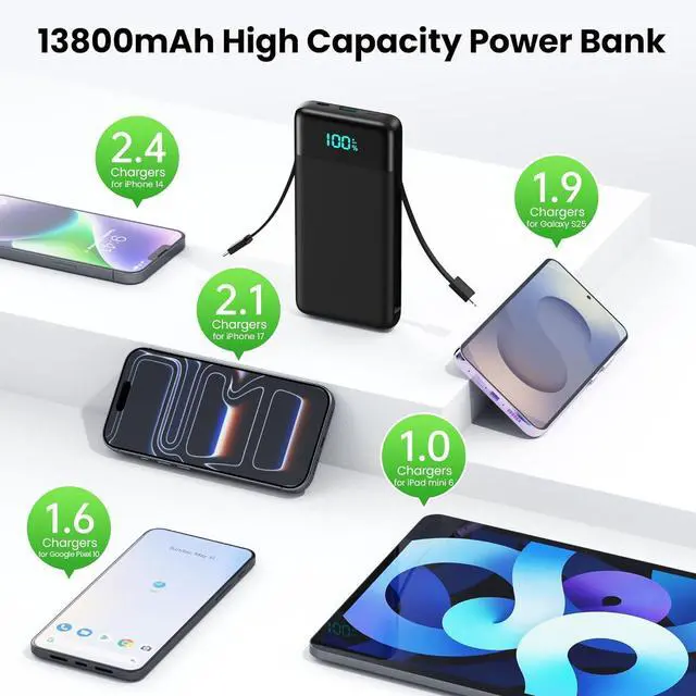 Simply use the built-in cable or your ownIts designed to be your one-stop power solution for every device in your life. Charge 4 Devices at Once Power through your day without battery anxiety. This portable station can simultaneously charge your 4 devices. Whether you're at the airport in a coffee shop or at your desk keep your entire tech devices powered up and ready without waiting. 13800mAh Power Bank in an Incredibly Slim DesignDesigned for on-the-go use this power bank with built-in cable features an ultra-slim profile ( 5.9 x 2.7 x 0.7 inch) and lightweight (220g) making the external battery easy to carry in your pocket or palm.