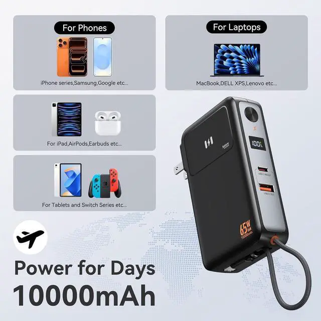 Note: Only WALL CHARGER mode can charge the laptop portable charger mode cannot charge the laptop. Compatible only with laptops with a maximum power of 65W35W Portable Charger ModeProvides 35W max output via built-in cable + USB-A/USB-C ports. Support QC 3.0 /PD 3.0 /SCP/FCP/AFC and other fast charging protocols perfectly adapted to iPhone 17/16/15/14/13 series tablets headphones and other devices. Smart Display for Power Control LED screen tracks every 1% like a gas gauge. See real-time charging speeds (fast-charge icon lights up! ) battery status and activate safe low-power mode for AirPods/smartwatches with a double-click. TSA-Friendly Travel Hero 10 000mAh capacity meets airline limits. with auto-shutoff protection and surge control. Charges 3 devices at onceideal for family trips or work-from-anywhere setups. Lifetime Backup Guarantee Includes 24-month warranty + 24/7 U. S. -based support.
