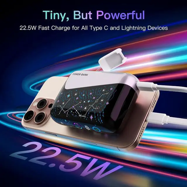 Supercharge Your Devices Experience lightning-fast charging with our advanced 22.5W fast charge technology. In just 30 minutes it can charge your iPhone 16 Pro up to 60%. When it comes to recharging the power bank itself it can be fully charged in as fast as 2 hours depending on the power adapter you use. Speed up your life with this turbocharged companion! Innovative Dual-Purpose Cable Weve revolutionized convenience with our dual-head charging cable(Type-C and Lightning). It is usually used as a strap to keep your power bank close and handy then effortlessly detach it when you need to charge.