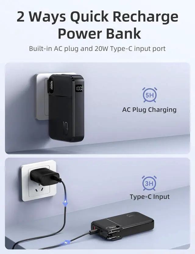 Portable Charger AC Wall Plug: The Rorry portable charger AC wall plug built in allows you to recharge itself directly from the wall outlet do not need to carry adapter and cables everywhere any more.
