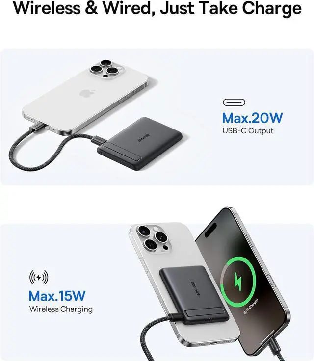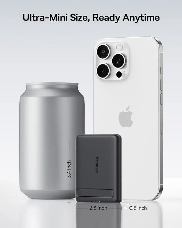 ?? Smallest But MightyAt just 3.4 x 2.3 x 0.5 and only 0.3 lb it's size is like that of a credit card and lighter than your phone. This magsafe portable charger slips perfectly into pockets gym bags even walletstake power anywhere super-mini design means you'll barely notice it until you need instant power. The proven smallest 5 000mAh QI2 magnetic power bank on the marketKeeps your iPhone charged up all day long anytime anywhere.?? Super Fast ChargingEquipped with a 15W Max QI2 wireless charging and a 20W Max USB-C port whether using it as an iPhone wireless charger or charging via USB-C you can effortlessly charge your phone at home or on the go.
