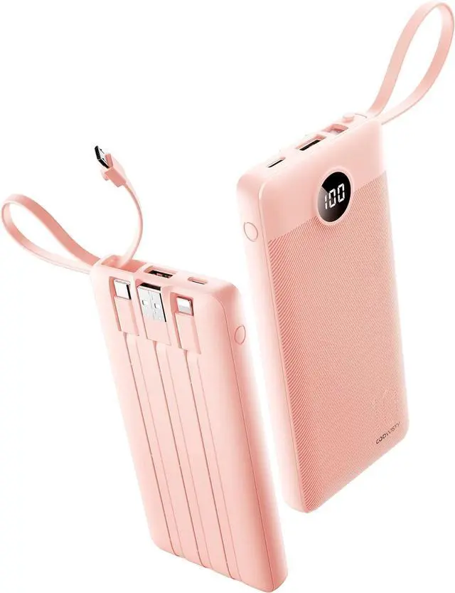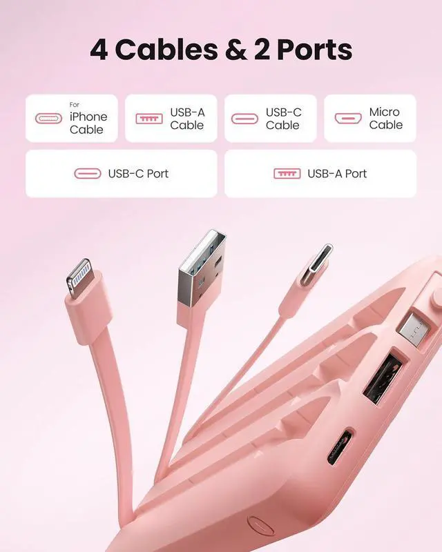 Slim Portable ChargerMeasuring just 5.7 x 2.7 x 0.73 inches and weighing only 9.17 ounces this ultra-compact power bank is incredibly lightweight and pocket-friendlyslip it into your jeans purse or backpack with zero bulk. Portable Charger with Built-in 4 CablesFeaturing a unique built-in 4-cable system (USB-C USB-A Micro USB Ligtning) there's no need for extra charging cablessimply plug in and power up most smart devices on the market. Charge 5 Devices At OnceEquipped with 5 output ports and 2 input ports this power bank supports pass-through chargingcharge the power bank and your devices simultaneously. The USB-C port is bidirectional (12W max input/output) while the USB-A cable offers 10W max input.