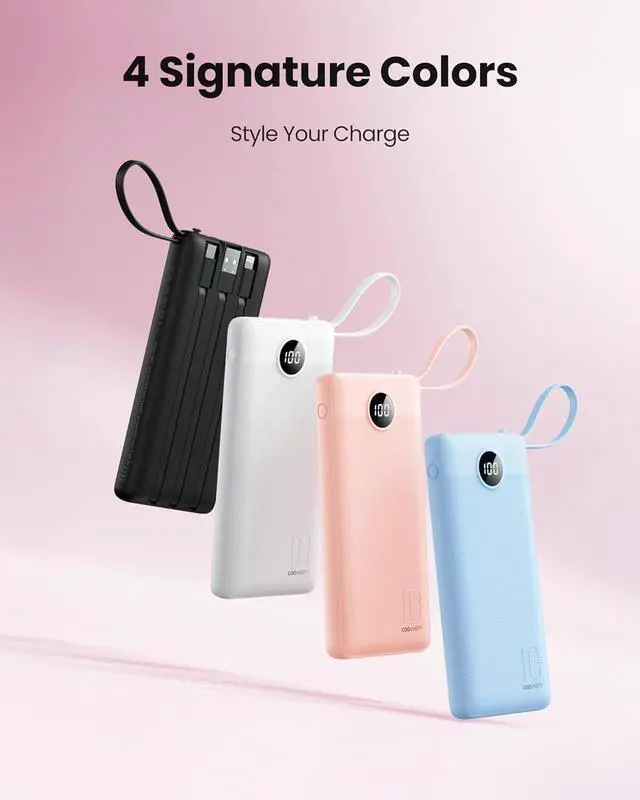 For outputs the USB-A port Micro USB cable USB-C cable and Ligtning cable all deliver 12W max powercharge up to 5 smart devices at once from phones and tablets to earbuds. LED Display Power BankSay goodbye to guessing battery life from LED lightsthis power bank features a clear digital display that shows remaining battery life in real-time percentage so you always know exactly when to recharge. Micro USB Game-ChangerExtend it to charge Micro USB devices then retract it into a handy lanyard for easy carrying. Whether you're gripping it on the go or hanging it from your bag this portable charger combines convenience with effortless style for seamless travel and daily use.