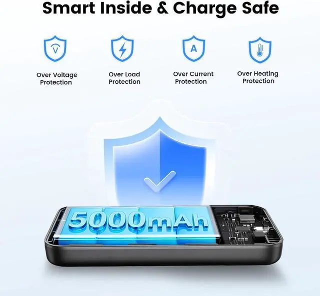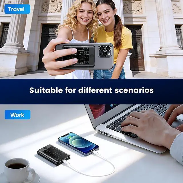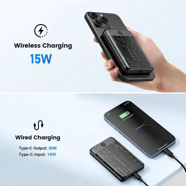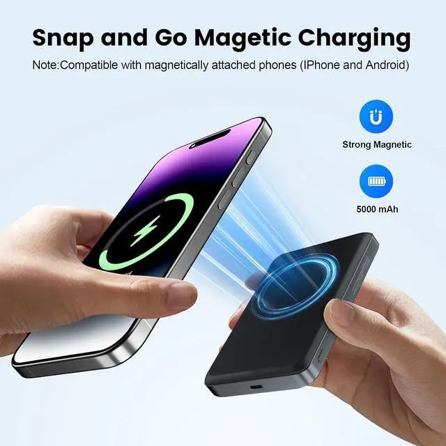 Magnetic Charging: The magnetic charging function of the Power Bank is very convenient! You don't need to plug in a cable to charge your phone. Just attach the power bank to your phone and it will start charging automatically! It's very easy to use and saves you time and effort! (Compatible with magnetic charging iphones/Androids)5000mAh