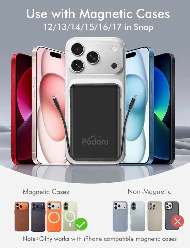 SeriesBuilt-in Cables & Strong Magnetic: This podoru portable charger iphone has built-in double USB C charging cables perfectly compatible with iPhone or Type-C devices no need to carry extra cables; Besides portable phone charger with the newest magnetic technology (stronger magnetic and nano adsorption) can directly hold the back of your iPhone 17/16/15/14/13/12 Series5 Devices Fast Wireless & Wired Charging: This podoru portable charger for iphone supports up to 15W wireless charging; USB-C PD output up to 20W; up to 22.5W USB PD; supports up to 12W Lighting input and up to 20W USB-C input; supports charging up to 5 devices at the same time shared charging with no waiting; And the iphone battery pack uses soft silicone material to protect your phone from damage while wireless charging10000mAh Large