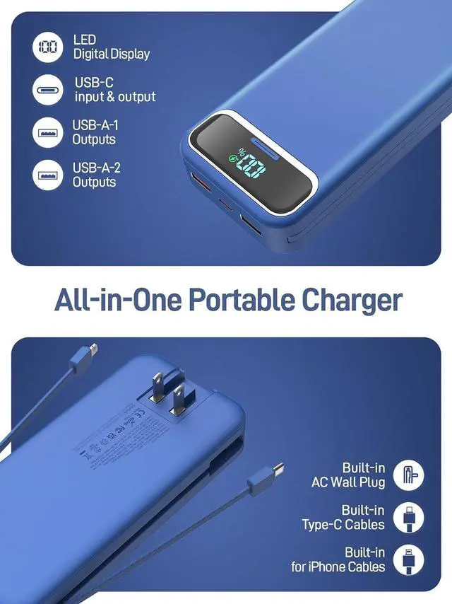 AC Wall Plug: 20000mAh portable charger built-in Type C and iOS 2 types cables compatible with iPhone USB C devices. Portable phone charger is built-in wall plug that charges the power bank itself directly from the wall outlet. You don't need to worry about carrying adapters and cables when travel.