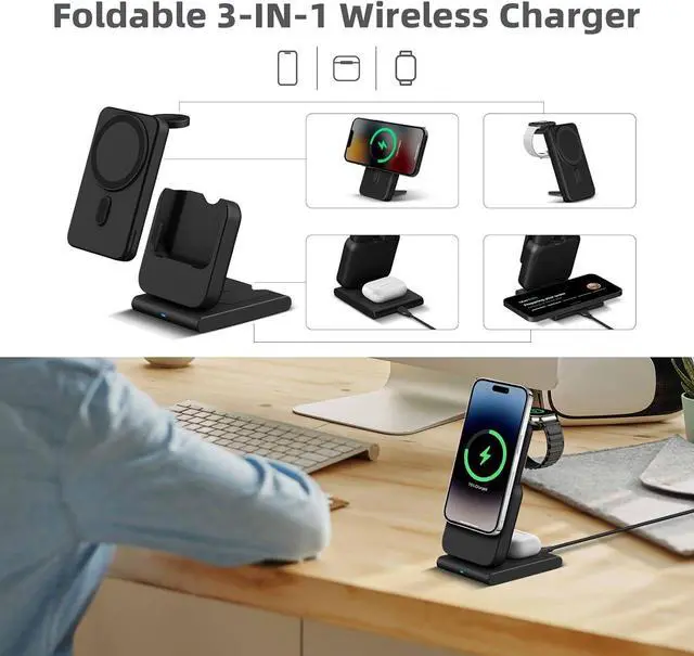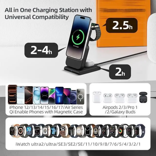 Wireless Charging Station: The 3 in 1 charger simplify your charging setup and eliminate cable clutter. It is compatible with the iPhone Air/17/16/15/14/13/12 Series Watch 11/10/9/8/7/6/SE2/SE/5/4/3/2 AirPods 2/3/Pro 1/Pro 2Portable and