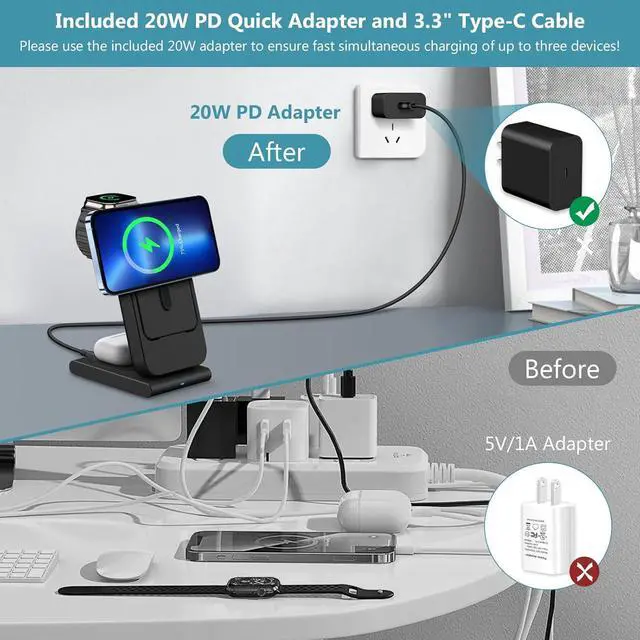 Gifts: Package includes a 3-in-1 wireless charging station a 5000mAh magnetic power bank a 1-meter long Type-C cable a PD 20W adapter and a user manual. Any problems please feel free to contact us
