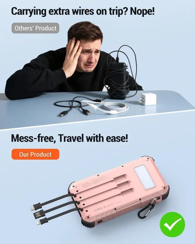 Size: The Solar charger is equipped with high-density lithium polymer battery which is smaller in size and larger in capacity compared with other normal ones easy to hold in single hand and put in pouch or pocket. Solar power bank can charge devices multiple times during the trip No more anxiety on the go! Built-in Fast Charge Cables for