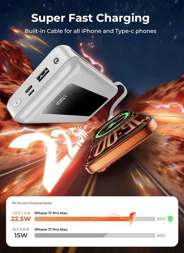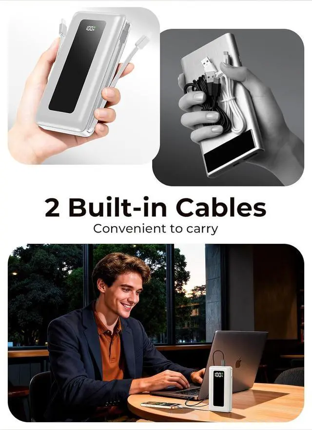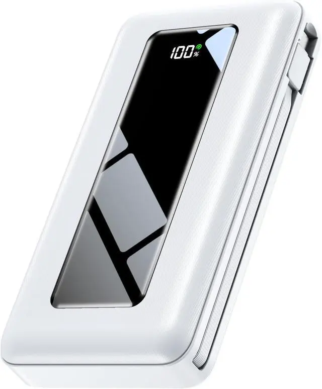 Cable: This portable charger power bank includes two built-in cables (iOS & USB-C) plus extra USB-A and USB-C ports letting you charge up to four devices at once. It powers your iPhone iPad drones or handheld gaming consoles with ease. Perfect for sharing with friends coworkers or family during travel commuting road trips or daily usean essential on-the-go charging solution. Outdoor-Ready Design LED Display & Flashlight Built In: Made for camping travel and emergency situations this power bank features a bright built-in flashlight for reliable lighting at night or during unexpected outages. The clear LED digital display shows the exact remaining power helping you plan outdoor activities with confidence. Compact durable and shock-resistant its designed to handle rugged environments with ease. PD 22.5W Fast Charging Quick