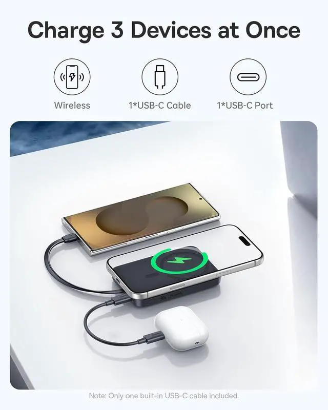 Once: The megnetic phone charger connect up to 3 at once thanks to a magnetic wireless charging pad a USB-C Cable and a USB-C port and a USB-C port. You can use the magnetic pad for your iPhone the built-in USB-C cable for a tablet and the extra USB-C port for wireless earbuds all at the same time. 10000mAh charges iPhone 17 1.8 x perfect for subway commutes coffee shop work or hiking trails.