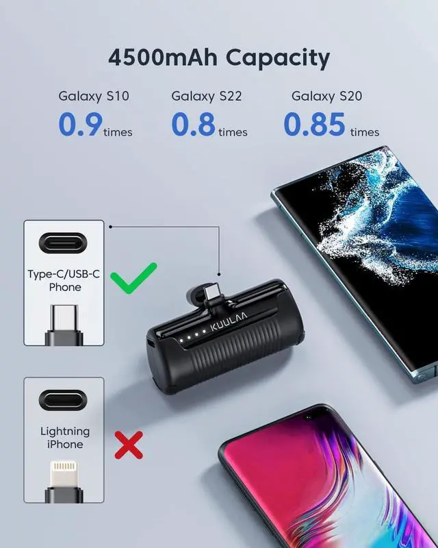 As light and mini as a lipstick fits in your pocket or purse to save space a portable emergency phone charger. Safe and smartUL2056 certified with triple protection (overcurrent/voltage/thermal). Beautiful shell not easy to scratch and fade. 4500mAh capacity (approximately one charge of a cell phone) eliminates low battery anxiety during travel/commuting. What do You Get7/24 customer support 2 x Kuulaa USB C Power Bank 1 user manual 1 charging cable. if you have any questions please contact us.