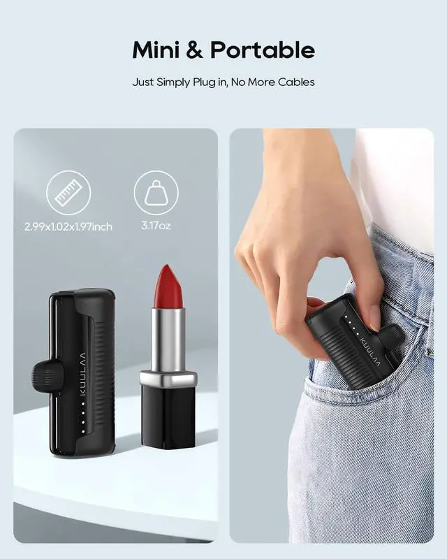 Simply Plug into Charge Unique built-in USB-C tip connects directly to your phone (no cables! ) combined with a lipstick-sized design ( 3.19 x 1.97 x 1.1 3.45 oz) to slip into pockets effortlessly. Perfect for thin cases (<4mm thick). USB C Users Travel Essentials Glossy pocket-sized design no extra cable needed the portable charger power bank is compatible with iPhone 17/16/iPhone 16 Plus/iPhone 16 Pro iPhone 15/iPhone 15 Plus/iPhone 15 Pro/iPhone 15 Pro Max Galaxy Motorola Google Pixel LG android phone and other USB C devices. Cordless& Ultra-CompactBuilt-in USB C cable eliminates the need for an extra charging cable just plug it into your phone and start charging.