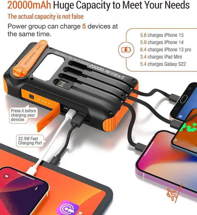 Power Bank: adopts 2023 latest advanced technology to combine the solar charger with a hand-cranked generator. Simply rotating the handle make it possible to provide power during an emergency or natural disaster. Besides it has multiple fast charging input ports and cable (Recommended recharge ways). Get power at any time! High