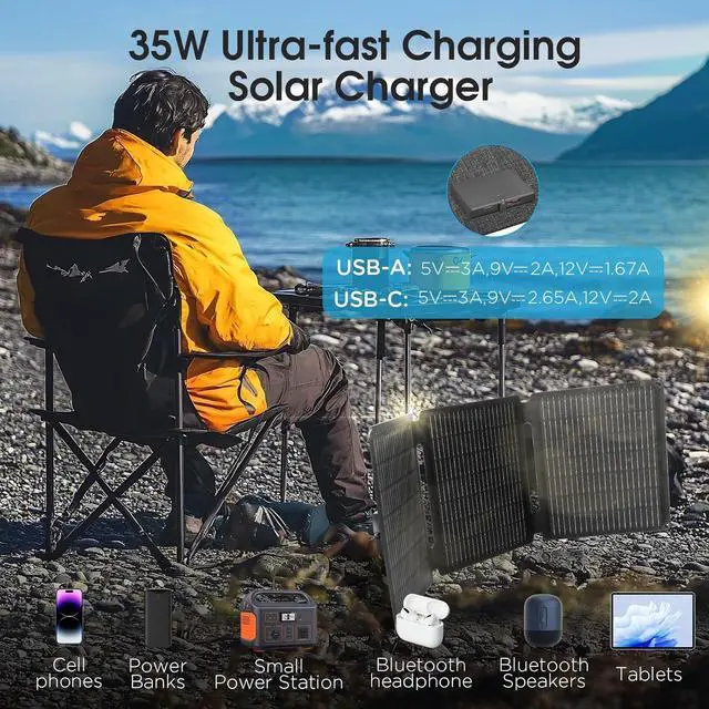 Multi-Output Port Design: This portable cell phone charger features multiple USB output ports providing diverse charging options. You can charge multiple devices simultaneously: 1 x QC 3.0 USB port (max 5V/ 3.4A 9V/ 2.5A 12V/2A) 1 x Type - C port (max 5V/3A 9V/ 2.2A 12V/ 1.6A ). This solar panel charger can quickly power up your smartphone laptop tablet power bank speaker iPad GPS device USB fan camera and other USB devices.