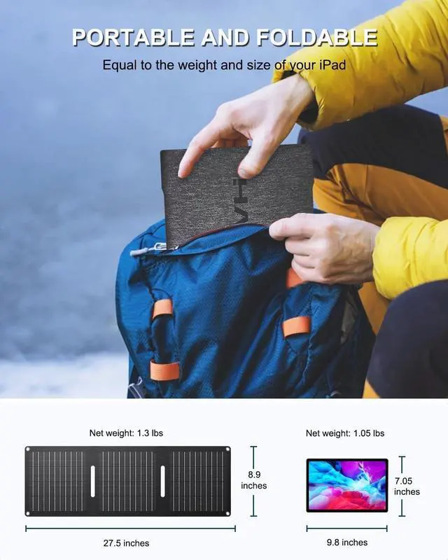 PORTABLE AND FOLDABLE: Our 21W backpacking solar panel charger is compact and foldable folding down to just 8.9 * 8.9 * 0.78 inches and weighing only 1.3 lbs. Easily slip this charger into your bag and enjoy the convenient power for camping hiking and backpackingDURABLE