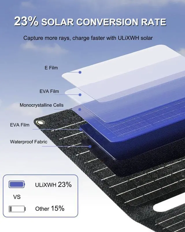 CHARGING AND SAFETY: The ULiXWH solar phone charger features dual USB ports (5V/3A) for efficient charging of multiple devices. Its advanced Battery Management System (BMS) boosts charging speed by up to 30% and includes built-in safeguards to protect against overcharging and overloadingULTRA