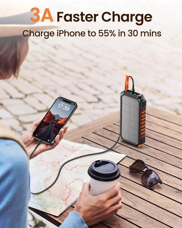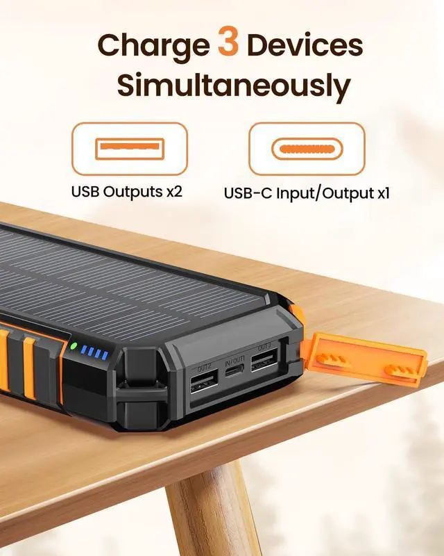 Three Outputs & Fast Charging: Featuring 1 USB C in/out port and 2 USB A output ports keep all your devices powered up on the go with our solar power bank's ability to charge up to three devices simultaneously. With 3A rapid charging the solar battery pack can juice up your iPhone 15 to 55% in just 30 minutes. Enjoy the convenience of fast and efficient charging on the go.