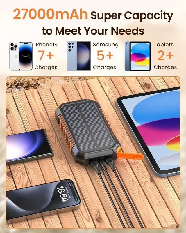 Huge Power Capacity: The solar charger boasts an impressive 27000mAh capacity which can charge your iPhone 15 over 7 times or your Galaxy S23 more than 5 times on a single charge. Enjoy days of uninterrupted use perfect for extended outdoor adventures or emergency situations.