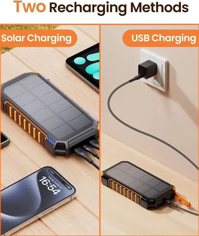 Dual Charging Methods: Versatility at its best our power bank can be fully recharged in 8 hours using a fast charge adapter or harness the power of the sun for emergency charging. No matter where you are you can always keep your devices powered and ready to go.