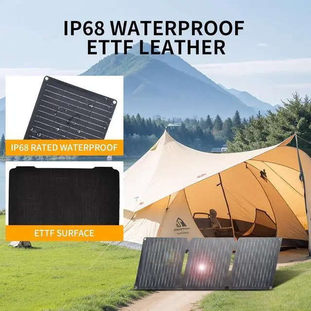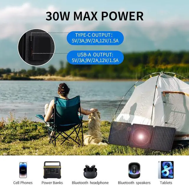 Universal Compatibility+Fast ChargingEquipped with 4 outputs (2×USB-A QC 3.0 1×USB-C PD18W 1×DC5521) this usb solar panel powers iPhones Androids MacBooks and CPAP machines. Includes 4 adapters (for Anderson/MCX) for seamless use as a panel solar portatil. Auto Voltage Detection ensures safe charging across devices. Military-Grade Durability & IP68 WeatherproofingCrafted with triple-layer ETFE + PET laminate this folding solar panel withstands hail UV exposure and -4°F to 158°F extremes. Its IP68 waterproof rating makes it ideal solar panels portable for storms beach trips or desert hikeswipe clean with a cloth. What Pack Including1 X 30W Portable Solar Panels 1 X DC-to-DC Cable 1 X 4-in-1 Connector 4 X Heavy-Duty Carabiners 1 X Waterproof Storage Pouch 1 X User Manual 24/7 U.