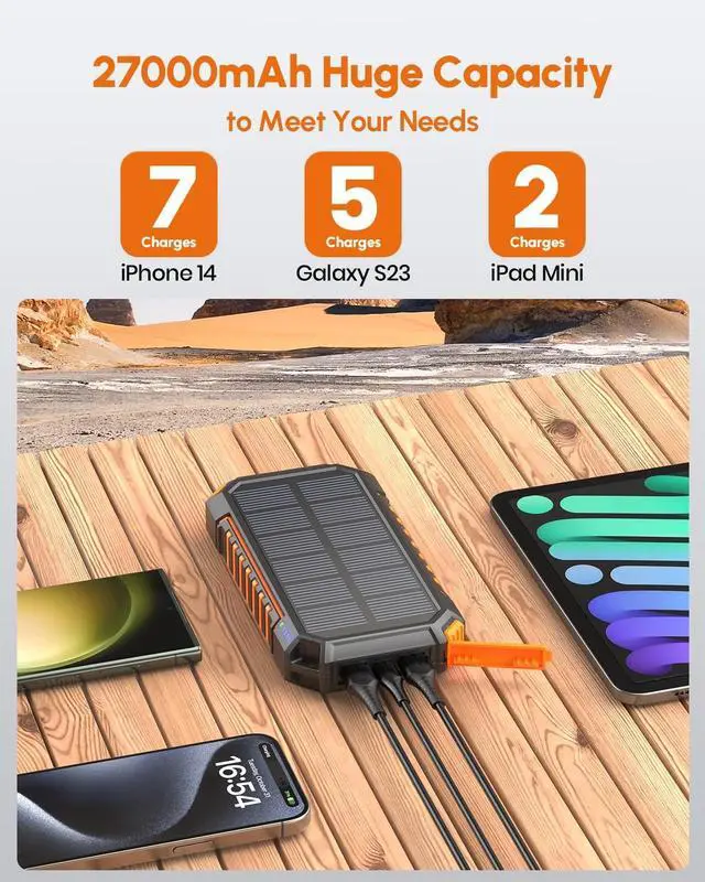 Massive Power: With a whopping 27000mAh capacity this solar charger can charge your iPhone 14 Pro over 7 times or Galaxy S23 over 5 times. Say goodbye to low battery anxiety with days of power on a single charge. Multiple Outputs & 3A