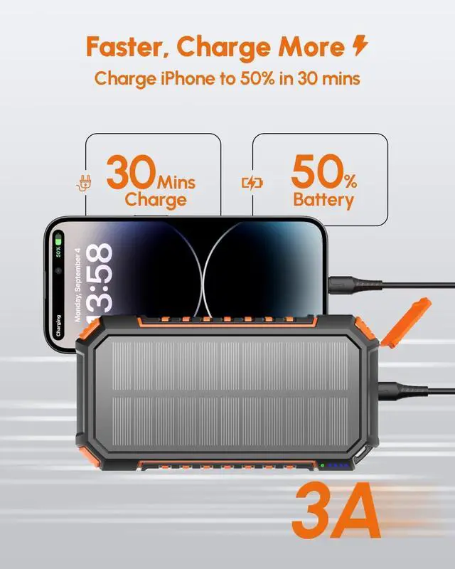 Fast Charging: This solar power bank can charge three devices simultaneously with convenient sharing while on the go. Fast charge an iPhone 14 pro to 50% within 30 minutes.